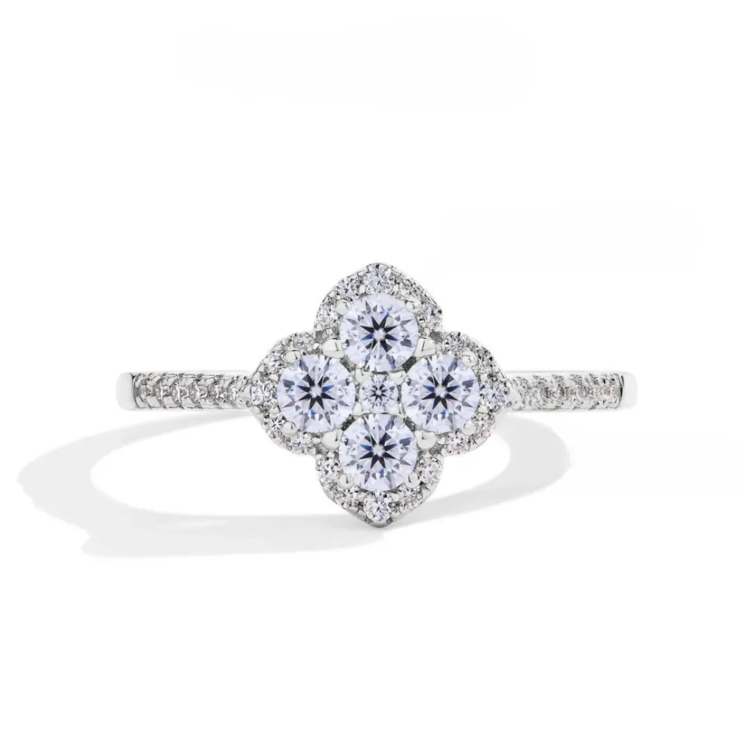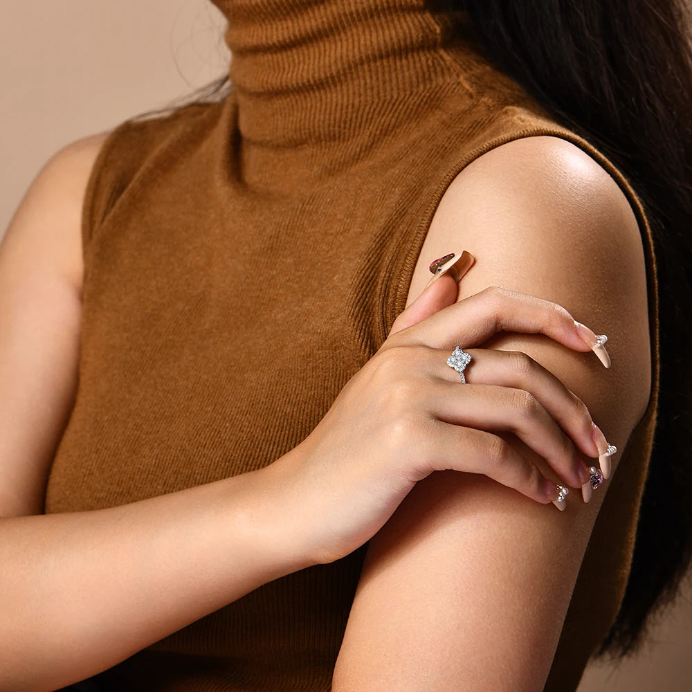 Sua moissanite de 1.0 quilate, lapidada com precisão, reflete a luz com intensidade serena — símbolo de um amor estável e autêntico. O aro em prata 925 com banho de ouro branco 18k envolve essa pedra com delicadeza e força, como quem segura uma história que merece durar.