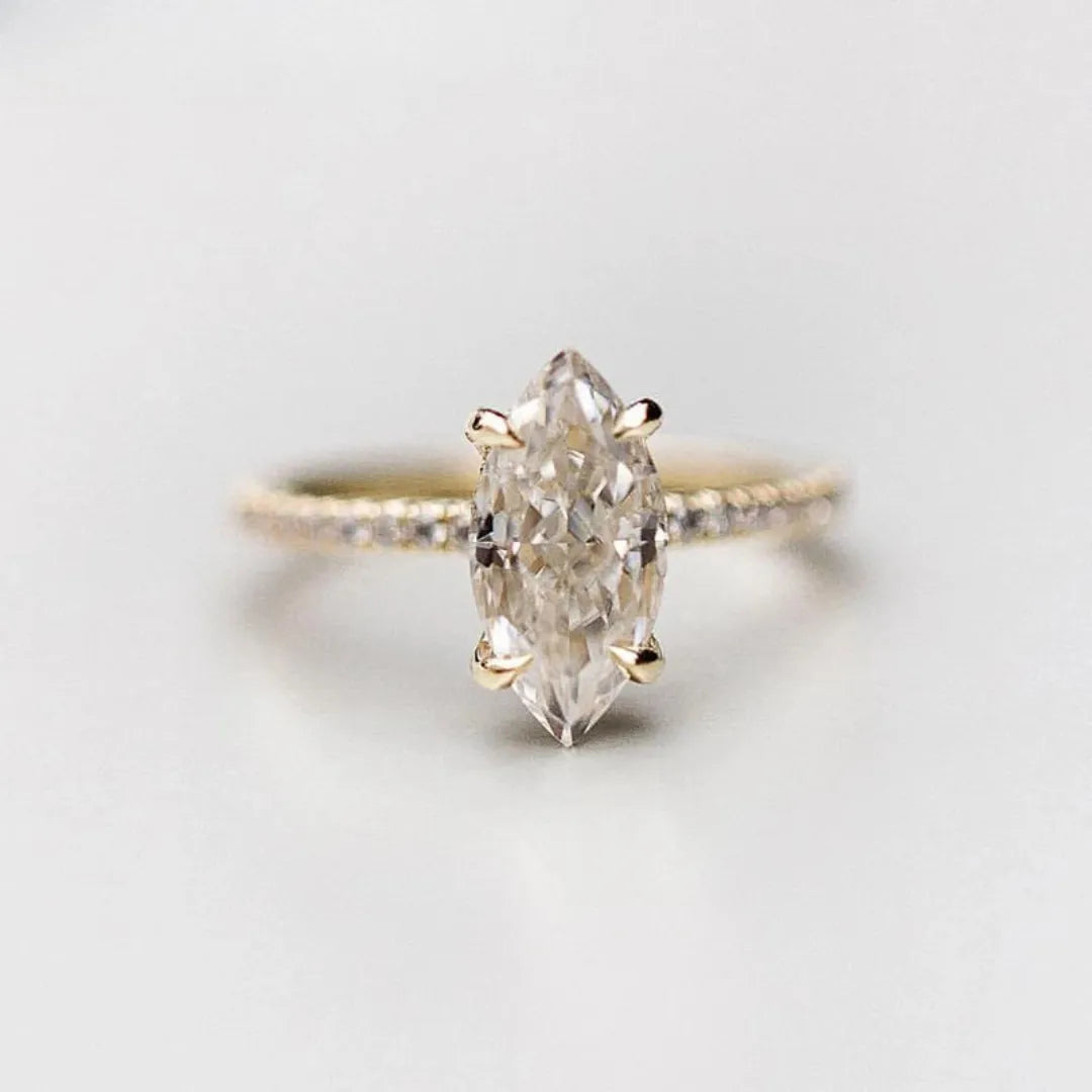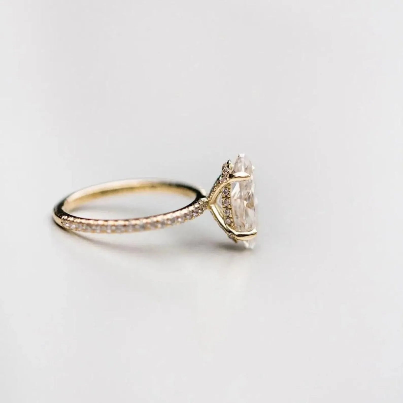 O Anel Evadne apresenta uma moissanita central de 3.0 cts, lapidada para revelar seu brilho mais puro e radiante. Um verdadeiro tributo à intensidade dos sentimentos que não precisam de palavras.