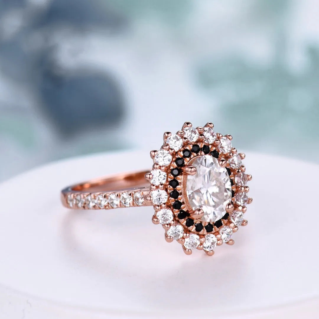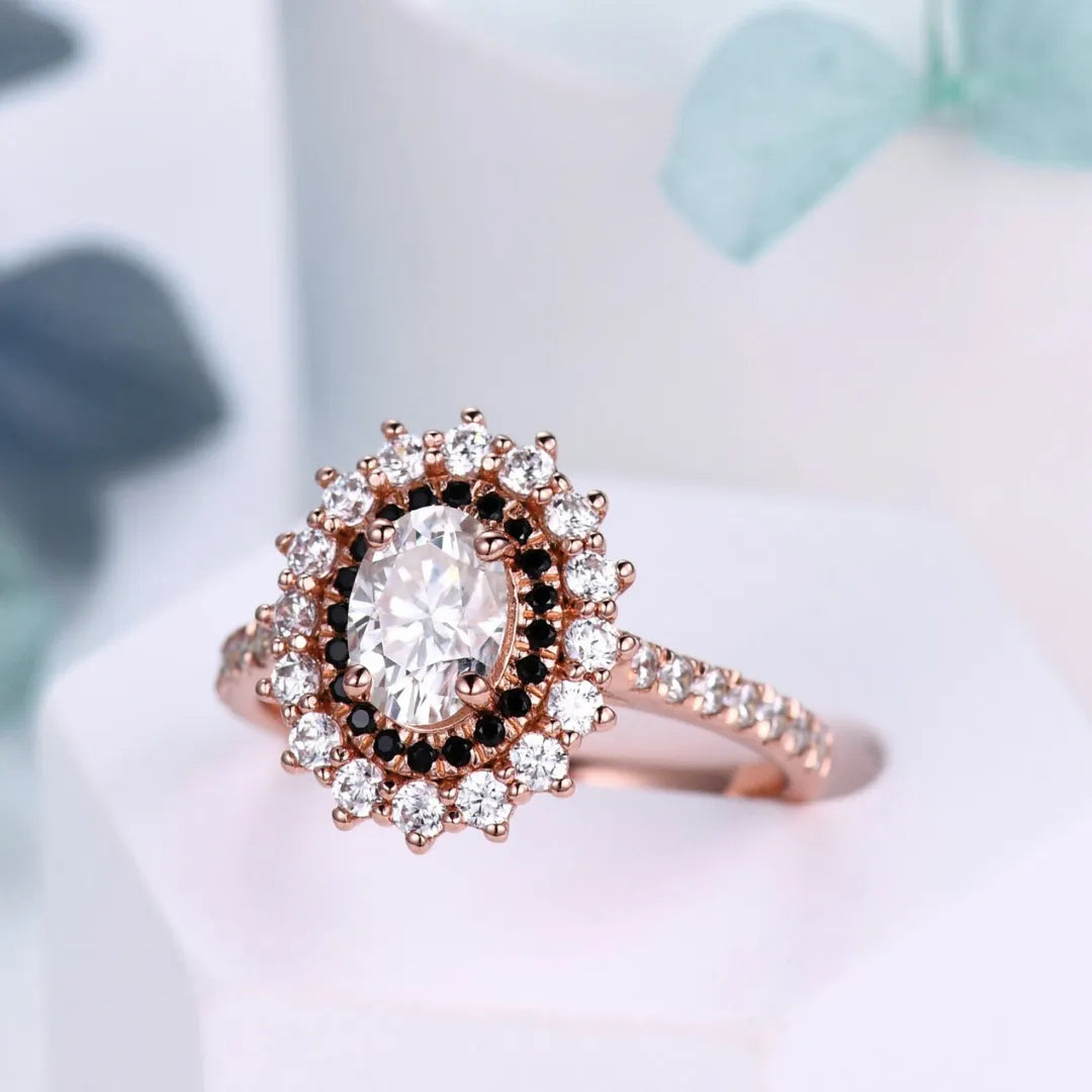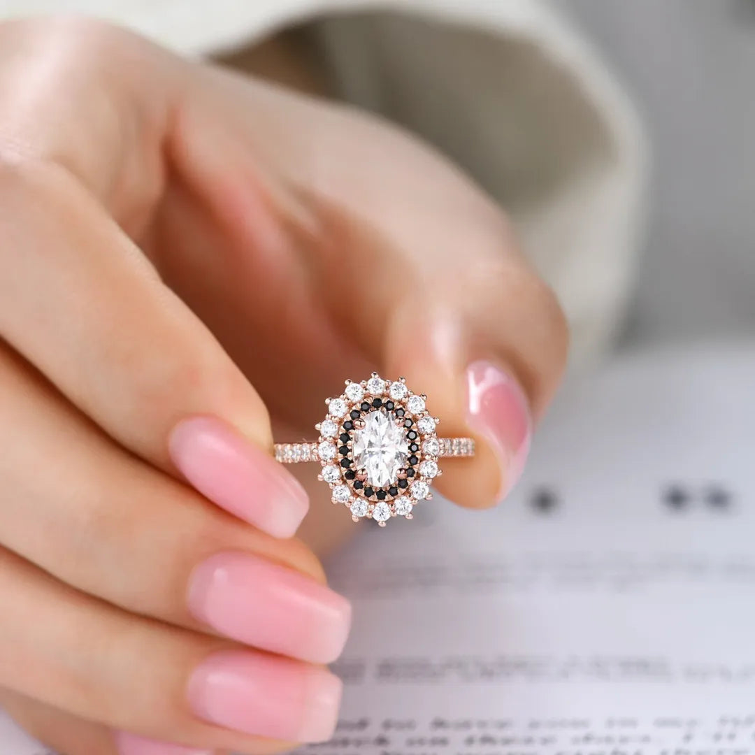 No centro da peça, uma moissanita branca de 1.0ct, lapidada em formato oval (5x7mm), irradia um brilho puro e nobre. Ao redor, pequenas moissanitas negras cuidadosamente cravejadas criam um contraste dramático e sofisticado — como luz e sombra em perfeita harmonia.