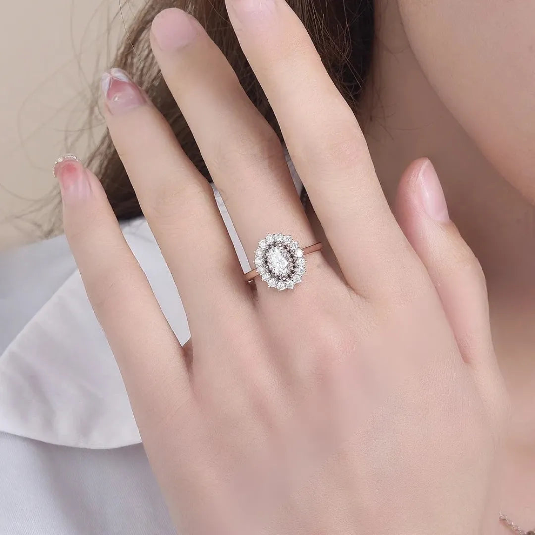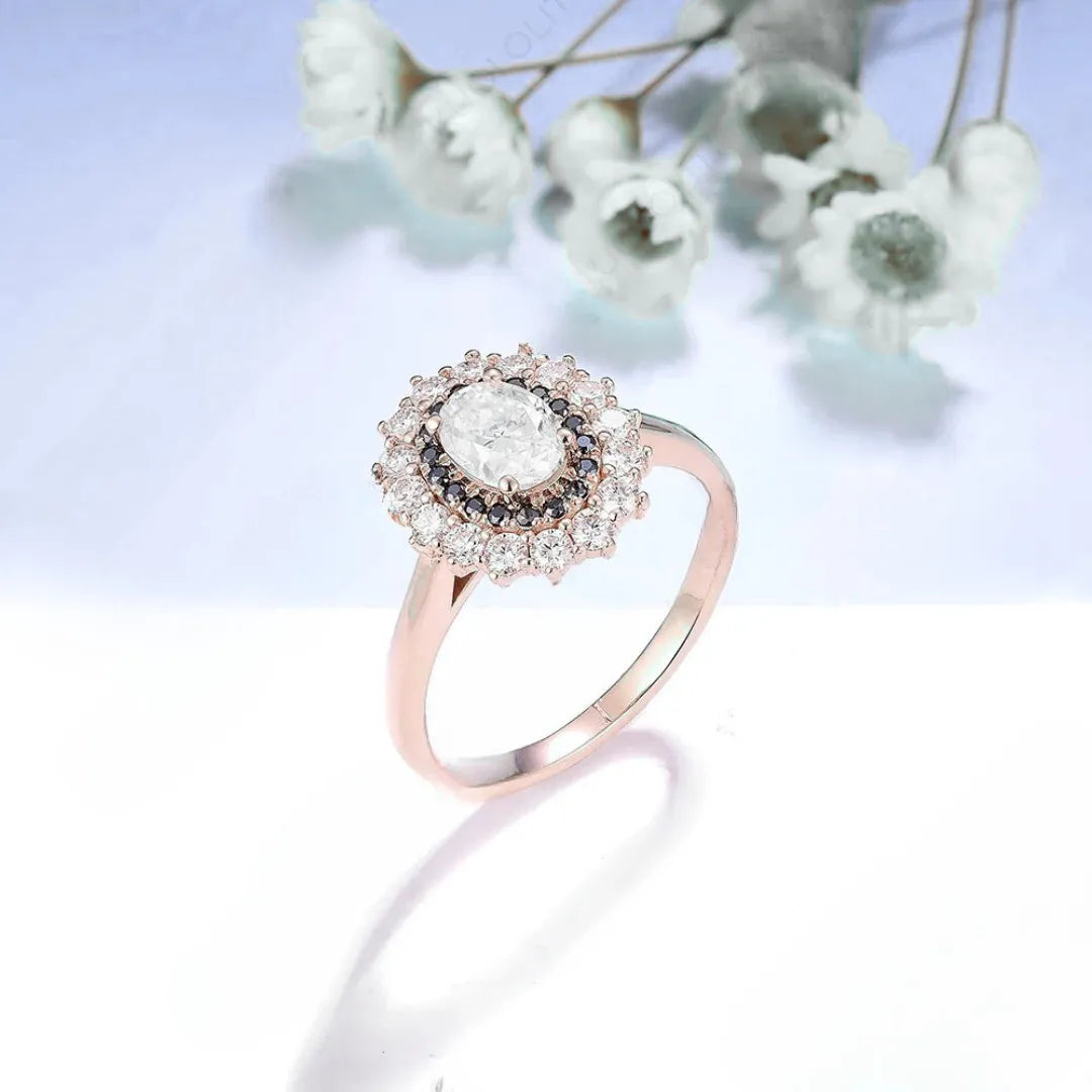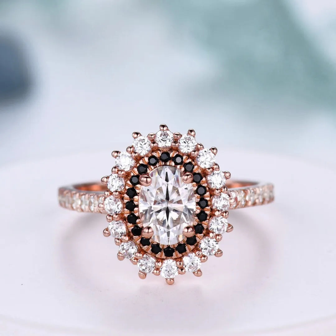 No centro da peça, uma moissanita branca de 1.0ct, lapidada em formato oval (5x7mm), irradia um brilho puro e nobre. Ao redor, pequenas moissanitas negras cuidadosamente cravejadas criam um contraste dramático e sofisticado — como luz e sombra em perfeita harmonia.