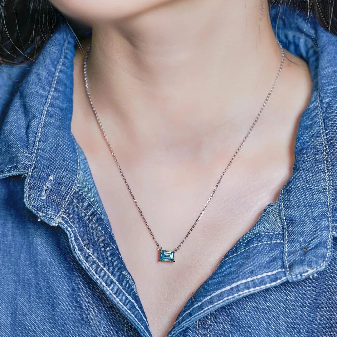 Seu destaque é uma deslumbrante moissanita ciano de 2.0 quilates, com 6 mm em corte retangular, que reflete a luz com profundidade intensa e coloração única. O contraste com a base em prata 925 banhada a ouro branco 18k transforma essa peça em um verdadeiro monumento à elegância.