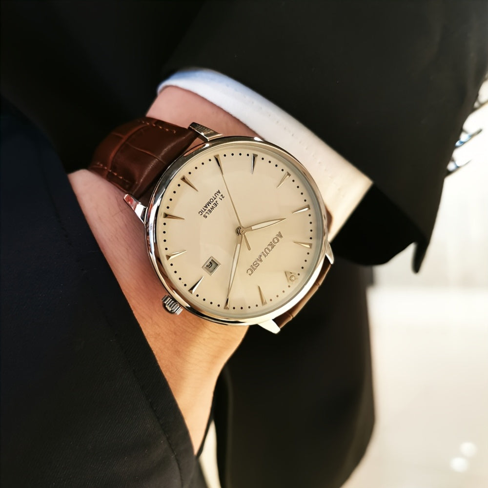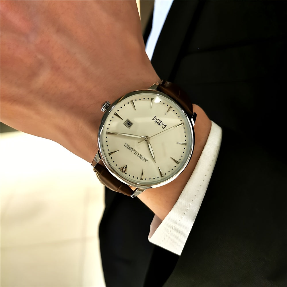 O Relógio Aether é movido por um mecanismo automático de excelência, que dispensa baterias e se mantém em funcionamento com o simples movimento do seu pulso — ou pode ser carregado manualmente, se preferir. Um tributo à autonomia e à sofisticação silenciosa.